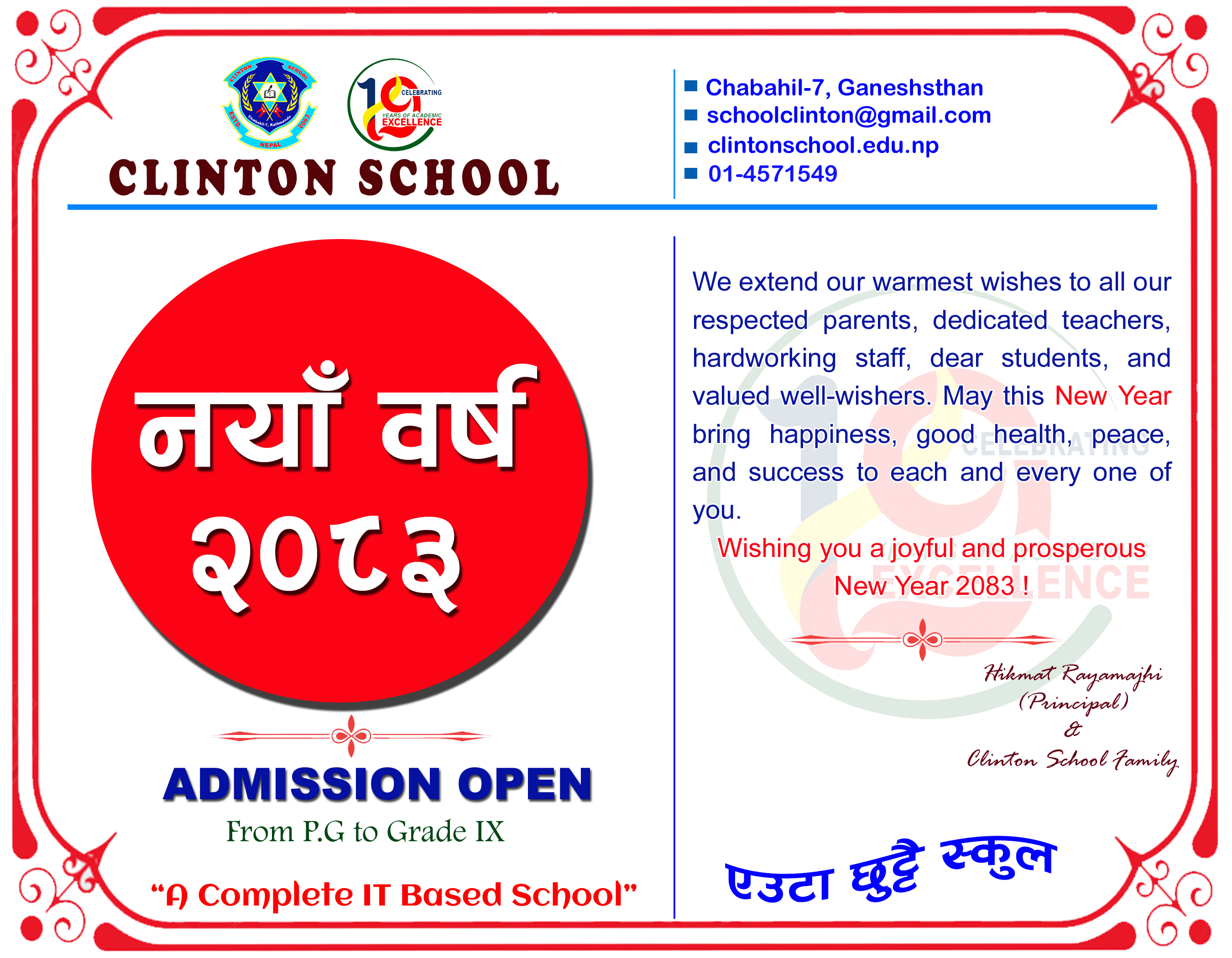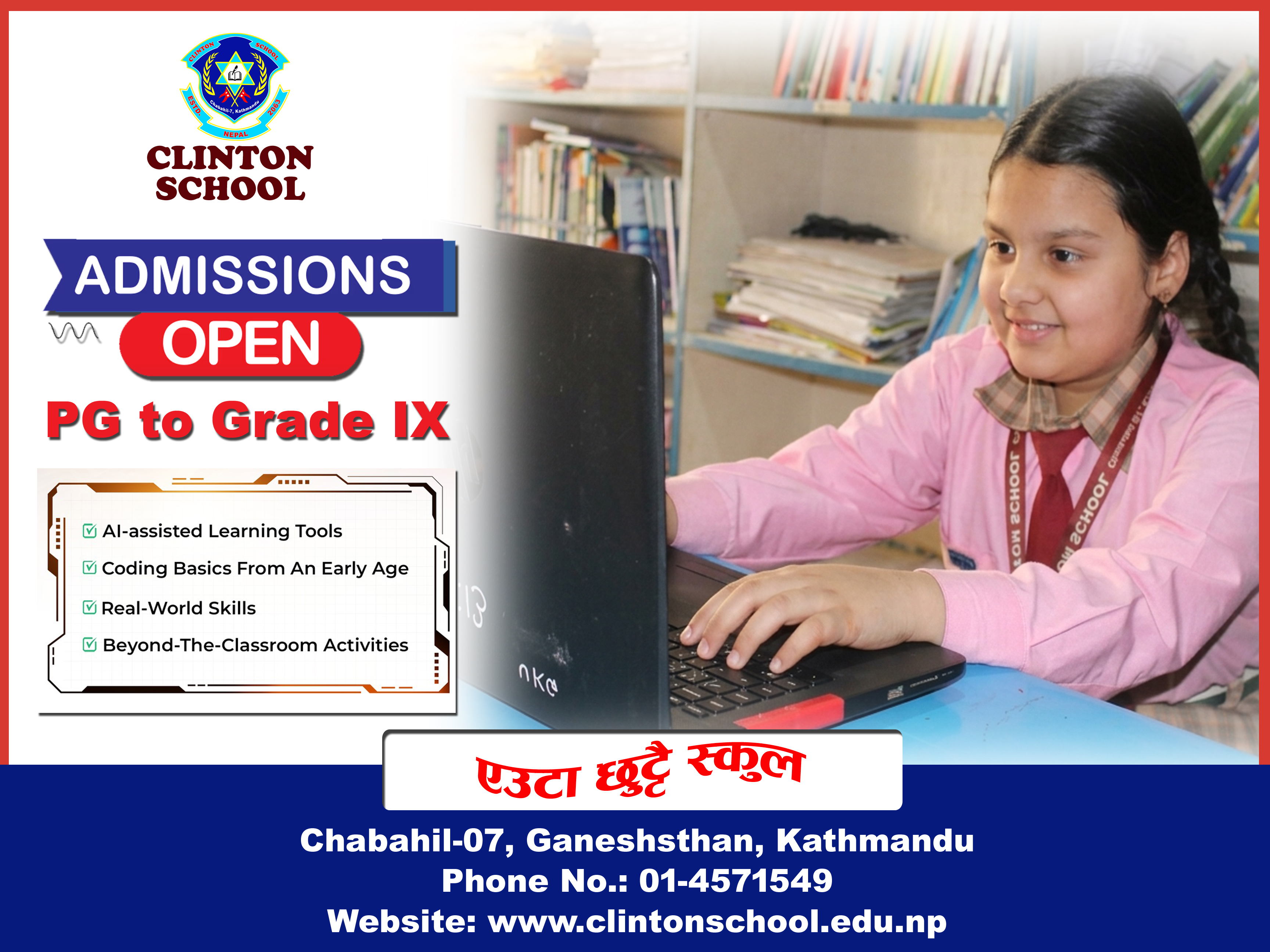 Clinton School Established in 2063 B.S, Located at Chabahil, is an english medium co-educational school. It is a child friendly school committed to import quality education. It has its own academic excellence in Kathmandu Valley. Child centered teaching learning activity is the core of education of Clinton School. Clinton School is run by a grou
